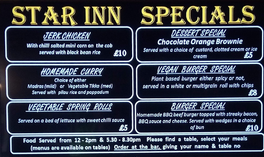 Our Specials Board changes a little every day but there’s always something fishy, a curry and a pie. The Ales are in danger of being drunk so change as the week goes by. Drop in to find what’s on today - |