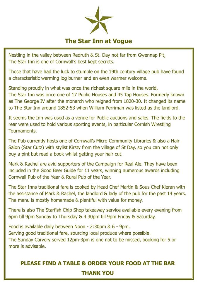 The Star Inn is easily found on the main road from Redruth to St. Day. There is plenty of parking and a large area for children to play. That area is also used for several music and real ale events.